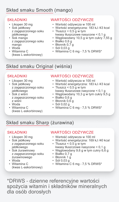 Lycopen PRO z witaminą C to pierwszy na świecie funkcjonalny napój antyoksydacyjny, który wspiera ochronę komórek przed stresem oksydacyjnym – jednym z najpoważniejszych zagrożeń dla zdrowia współczesnego człowieka. Dzięki unikalnemu połączeniu naturalnego likopenu oraz witaminy C napój ten wspomaga układ odpornościowy, chroni DNA i błony komórkowe przed uszkodzeniami oraz wpływa korzystnie na ogólną kondycję organizmu.
